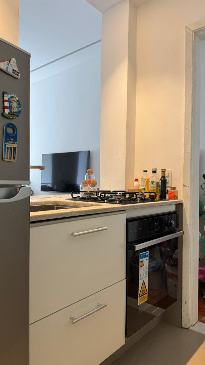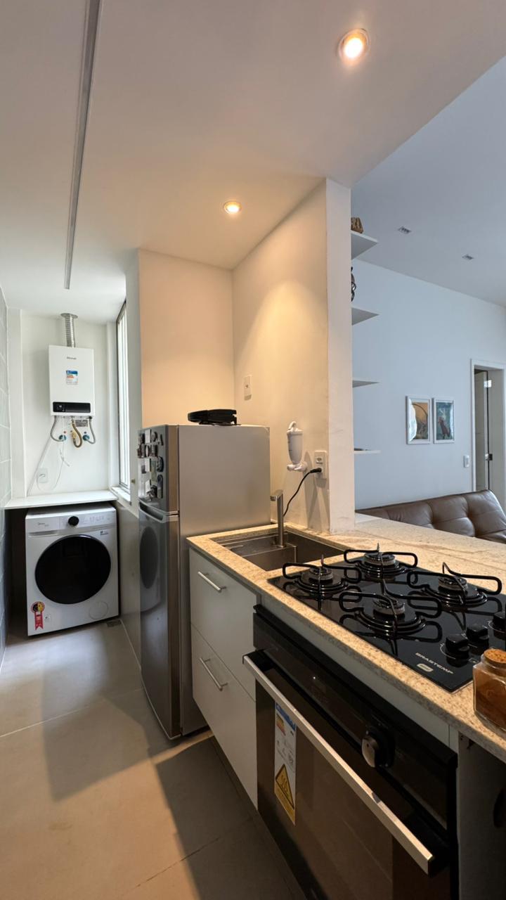 Apartamento reformado de 40m2, andar alto, bastante luz natural e sol da manhã. Quarto, sala, cozinha americana e pequena área de serviço. Prédio com portaria 24h. Não possui vaga de garagem.